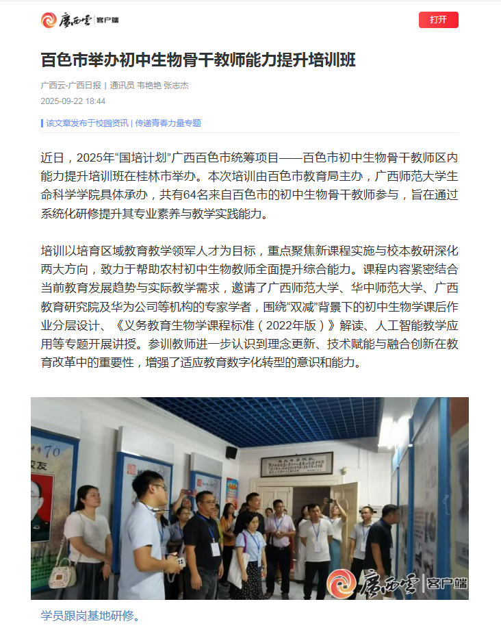 9月22日,广西云-广西日报以百色市举办初中生物骨干教师能力提升培训班为题,关注报道了我校2025年“国培计划”广西百色市统筹项目——百色市初中生物骨干教师区内能力提升培训班情况,详情如下: