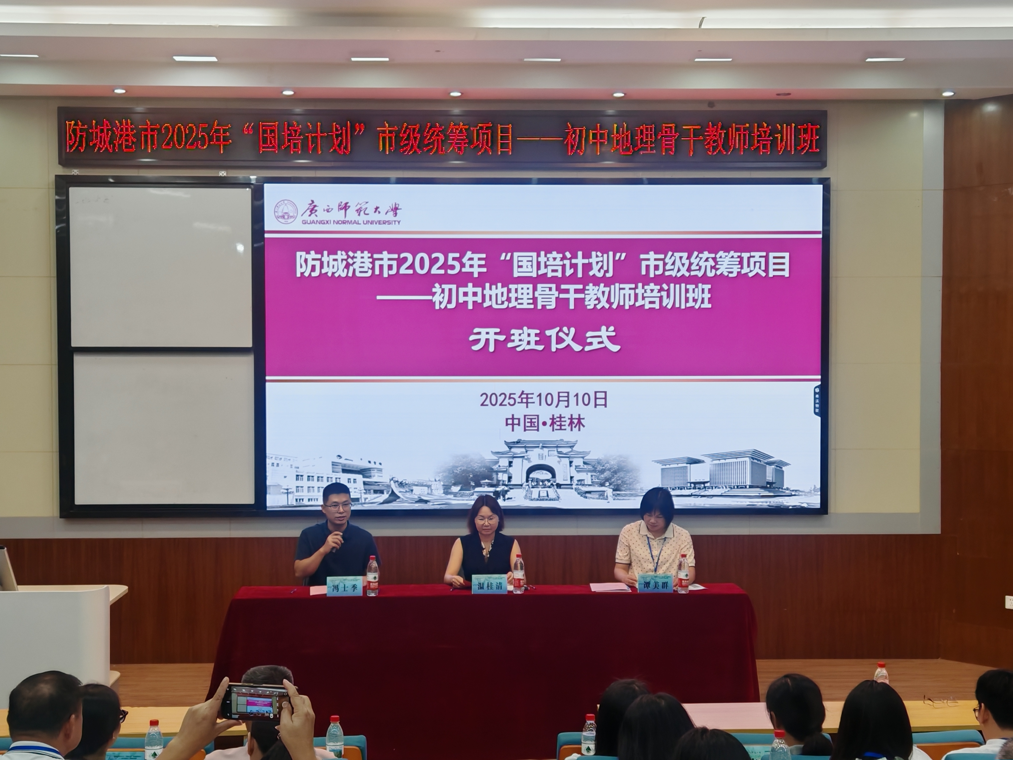 10月10日上午,由我校承办的2025年“国培计划”防城港市统筹项目——初中地理骨干教师培训班开班典礼在育才校区顺利举行,本次培训项目由我校环境与资源学院具体组织实施。学院院长温桂清、防城港市教育科学研究所副所长谭美群、项目班主任冯士季以及50名防城港市初中地理骨干教师参加典礼。