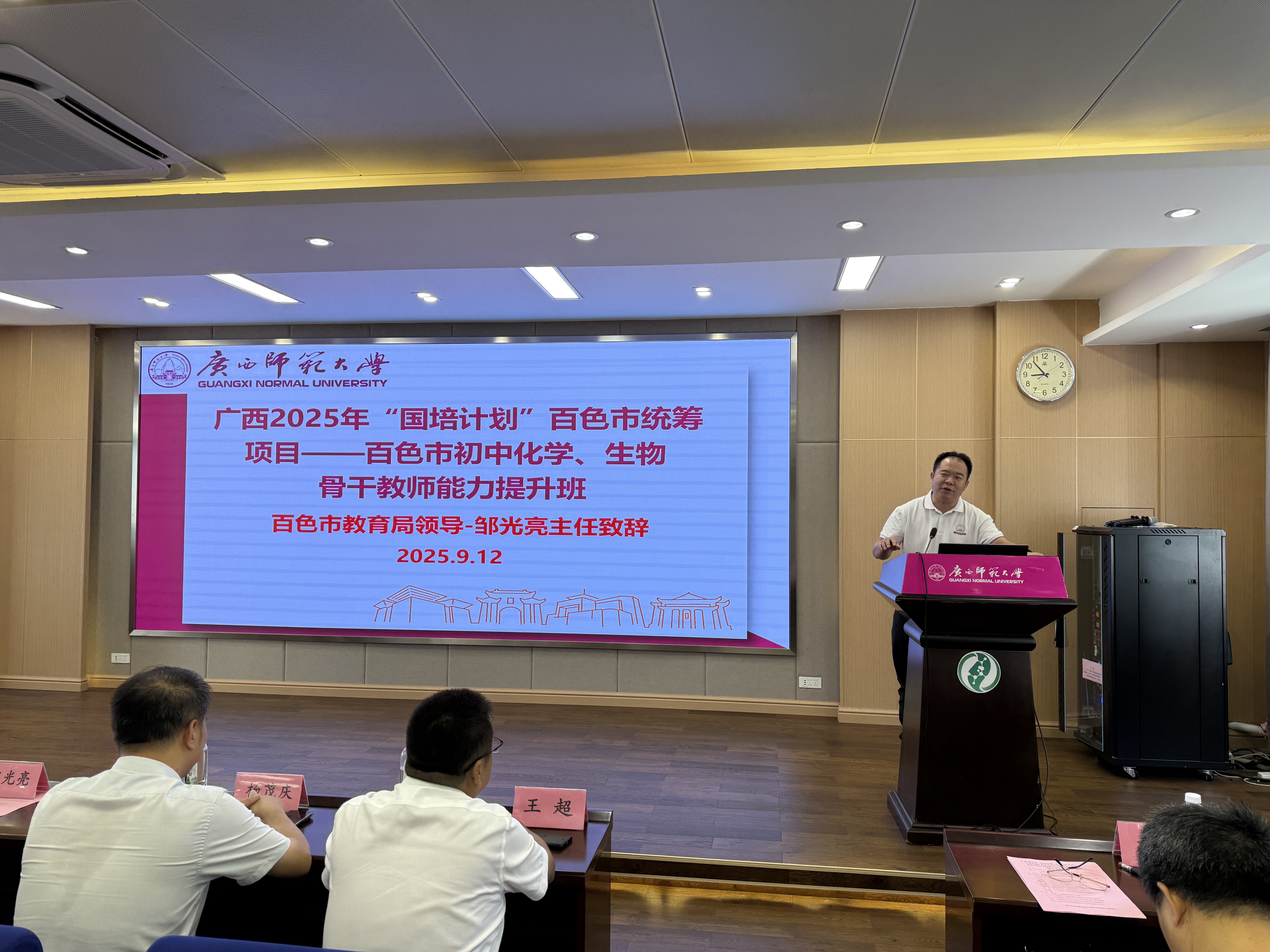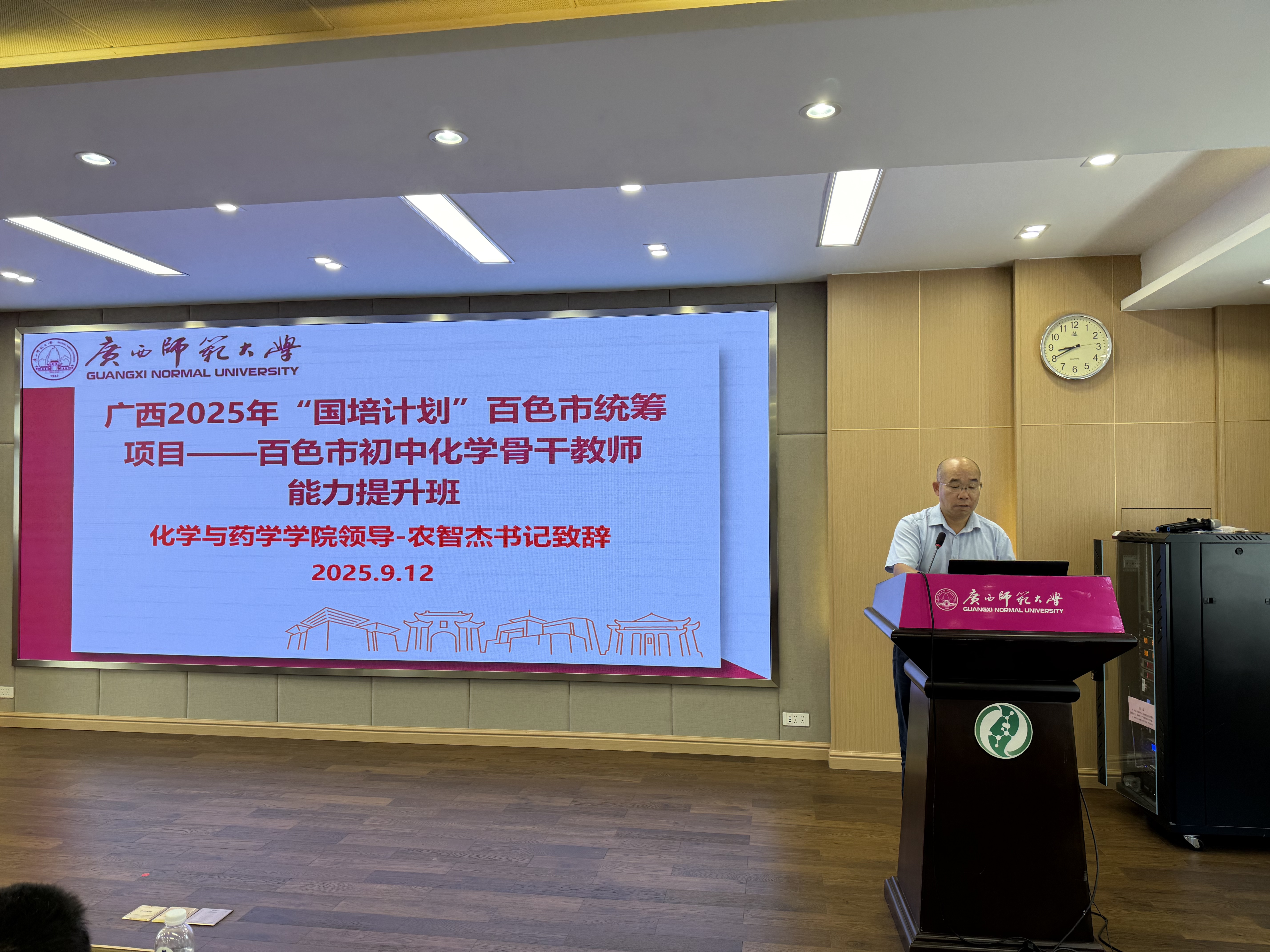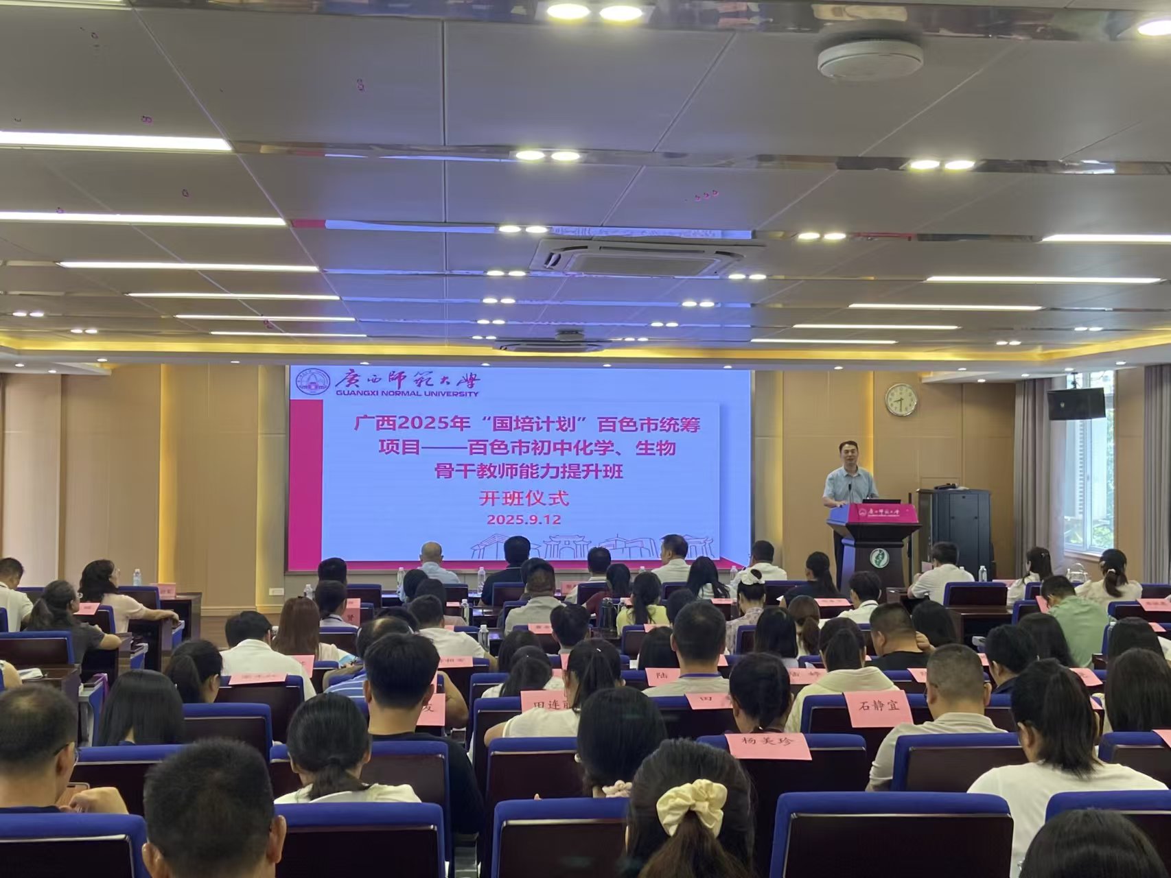 9月12日,由百色市教育局主办、广西师范大学承办的2025年“国培计划”百色市统筹项目——百色市初中化学和初中生物骨干教师区内能力提升班在我校顺利开班。本项目由化学与药学学院、生命科学学院共同组织实施。广西师范大学教师教育学院院长杨茂庆,化学与药学学院党委书记农智杰、院长陈振锋,生命科学学院党委书记王超、院长武正军,项目负责人唐劲军教授、韦艳艳副教授,以及百色市教育局教师发展中心主任邹光亮等出席开班典礼,来自百色市各区县的130名初中化学、生物骨干教师参加仪式。