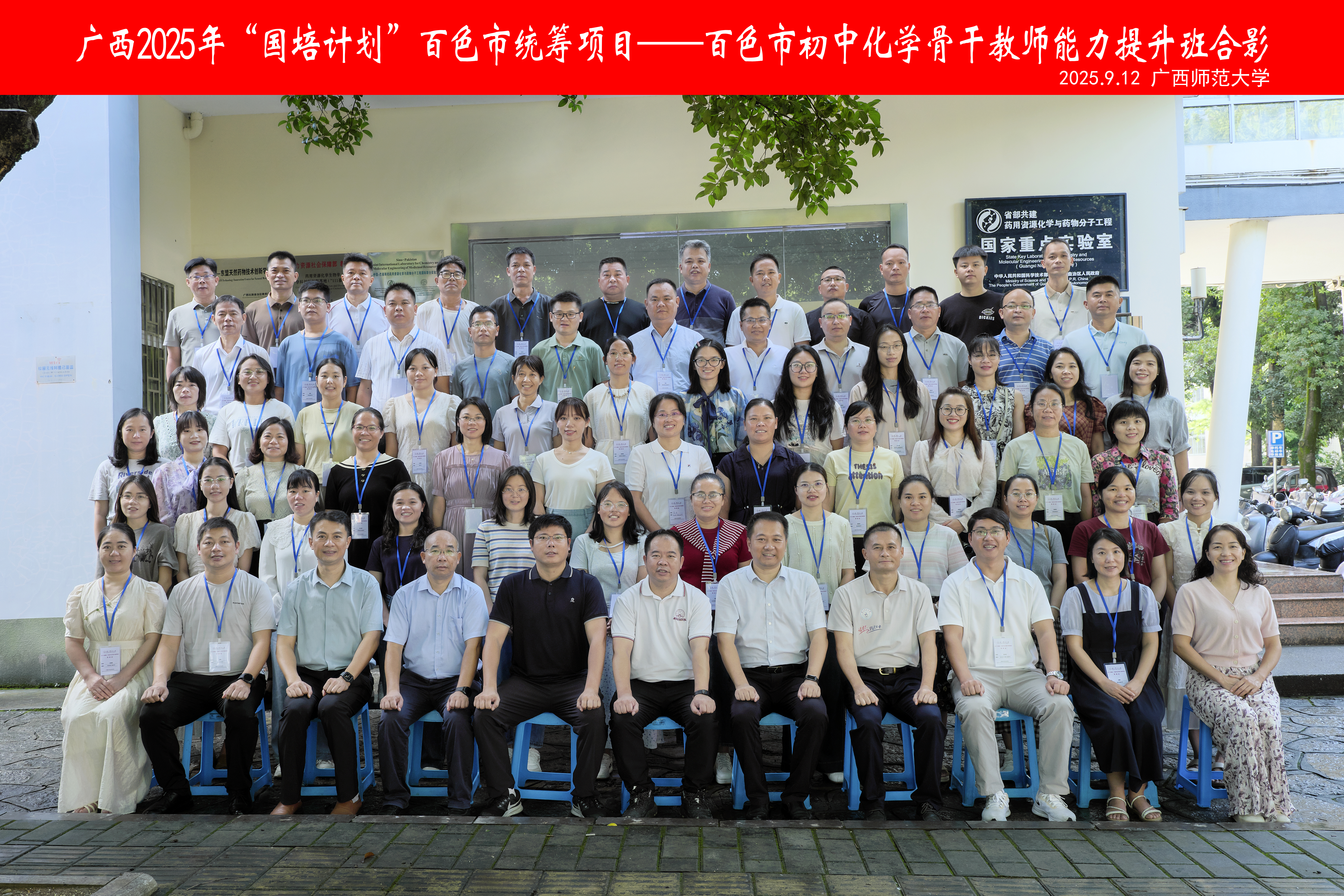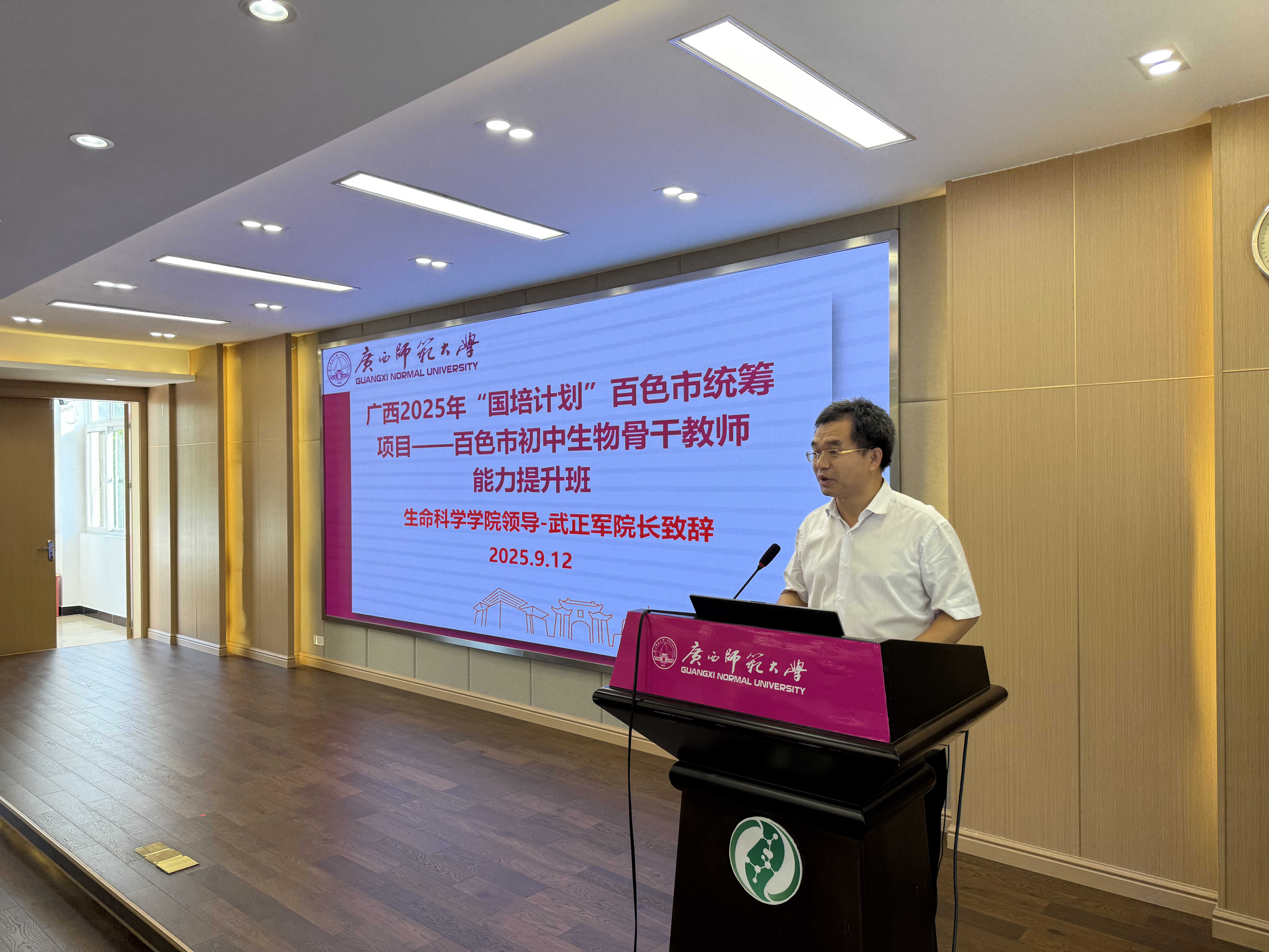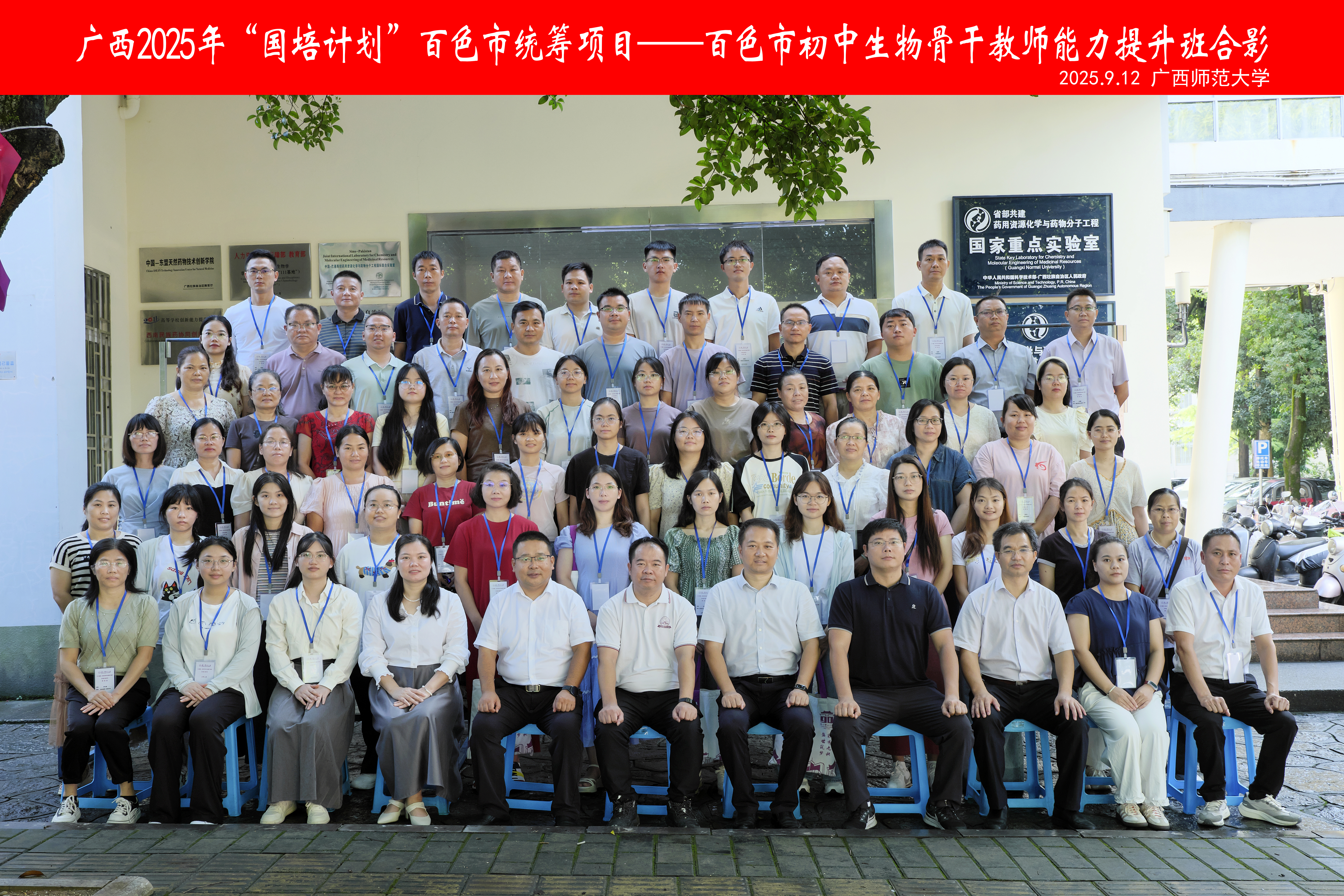 9月12日,由百色市教育局主办、广西师范大学承办的2025年“国培计划”百色市统筹项目——百色市初中化学和初中生物骨干教师区内能力提升班在我校顺利开班。本项目由化学与药学学院、生命科学学院共同组织实施。广西师范大学教师教育学院院长杨茂庆,化学与药学学院党委书记农智杰、院长陈振锋,生命科学学院党委书记王超、院长武正军,项目负责人唐劲军教授、韦艳艳副教授,以及百色市教育局教师发展中心主任邹光亮等出席开班典礼,来自百色市各区县的130名初中化学、生物骨干教师参加仪式。